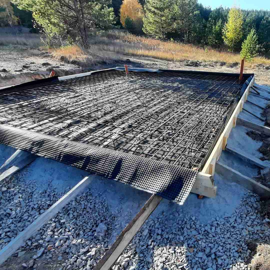 После трамбовки основания в вырытый котлован закладывается арматурный каркас. Пруты арматуры могут соединяться между собой при помощи проволоки или сварки. В зависимости от этого подбирается класс арматуры. Если планируется сваривать пруты, то в номенклатуре арматуры должна присутствовать на конце буква «С», например, «А500С». В остальных случаях класс арматуры неважен. Подбираются те стержни, диаметр которых составляет не менее 12 мм.